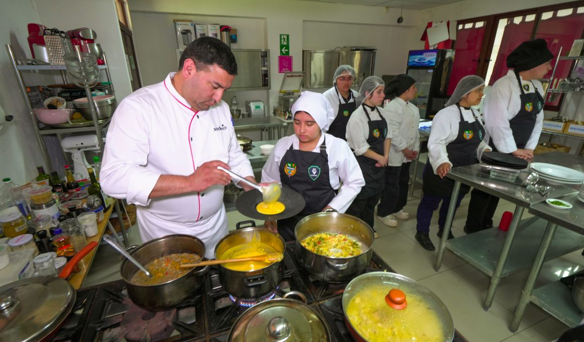 En esta ocasión, los y las estudiantes de tercero y cuarto medio de la especialidad de Gastronomía tuvieron la oportunidad de compartir una mañana práctica con el chef ejecutivo Cristián Díaz, quien lideró una experiencia real de cocina y servicio en el comedor didáctico del establecimiento.
