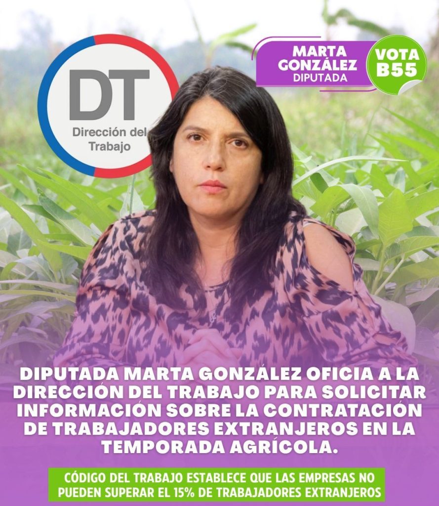 Ante el inicio de la temporada de cosecha de cerezas y otros frutos en la zona central del país, la Diputada de la Región de O’Higgins Marta González (Distrito 15)  ofició a la Dirección del Trabajo para solicitar información sobre la aplicación de la normativa laboral y migratoria en las contrataciones agrícolas de temporada.
