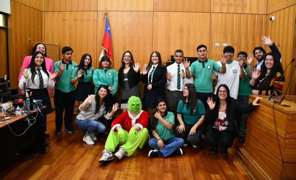 La sala estuvo compuesta por un alumno que cumplió la función de juez, el que fue acompañado por la jueza de Garantía de Rengo, Paulina Delgado; dos alumnas que realizaron la labor de fiscalas, las que recibieron la guía de la abogada asistente de la Fiscalía Local de la ciudad, María José Díaz; y el equipo de defensa del Grinch, compuesto por dos estudiantes y la defensora penal adolescente, Claudia Ojeda