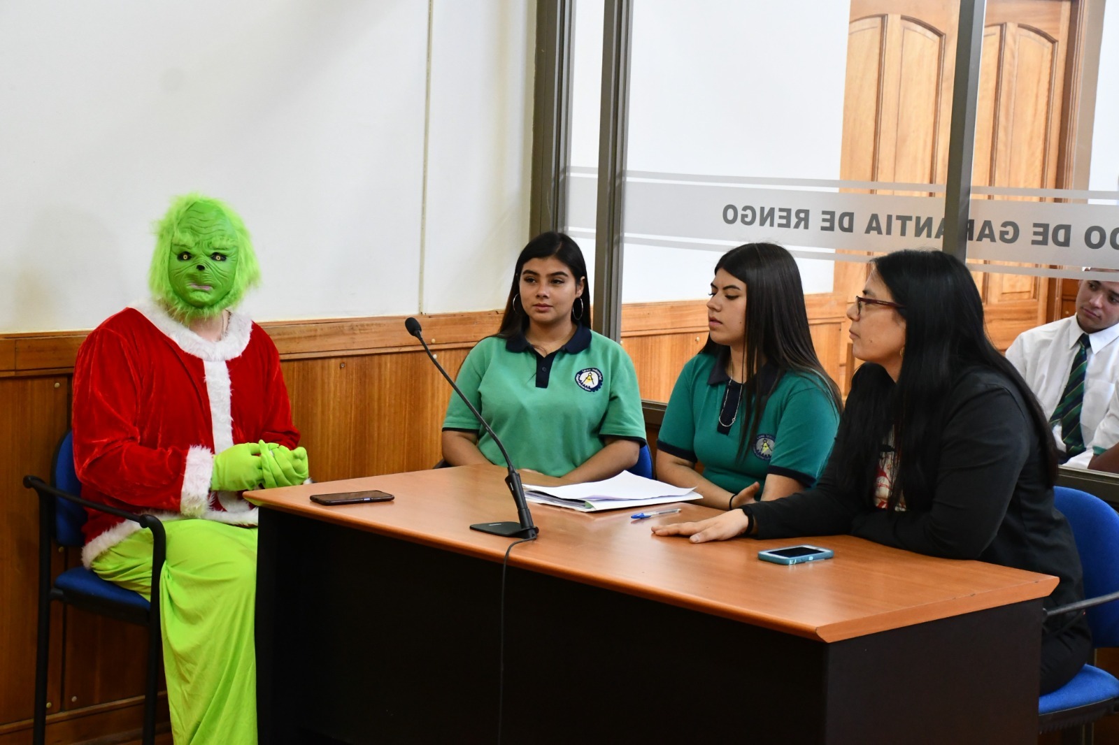 La sala estuvo compuesta por un alumno que cumplió la función de juez, el que fue acompañado por la jueza de Garantía de Rengo, Paulina Delgado; dos alumnas que realizaron la labor de fiscalas, las que recibieron la guía de la abogada asistente de la Fiscalía Local de la ciudad, María José Díaz; y el equipo de defensa del Grinch, compuesto por dos estudiantes y la defensora penal adolescente, Claudia Ojeda