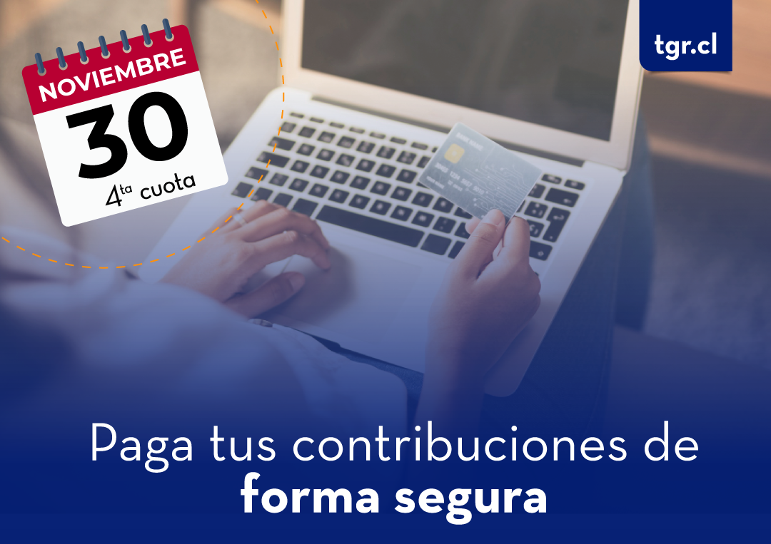 La Tesorería General de la República (TGR) recordó que el próximo domingo 30 de noviembre vence el plazo para pagar la cuarta cuota de contribuciones de bienes raíces 2025. Para facilitar este trámite, la institución dispone de múltiples canales de pago, entre ellos el sitio web www.tgr.cl, donde se encuentra habilitado un acceso directo para realizar la gestión de forma rápida y segura.