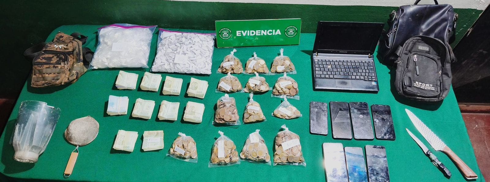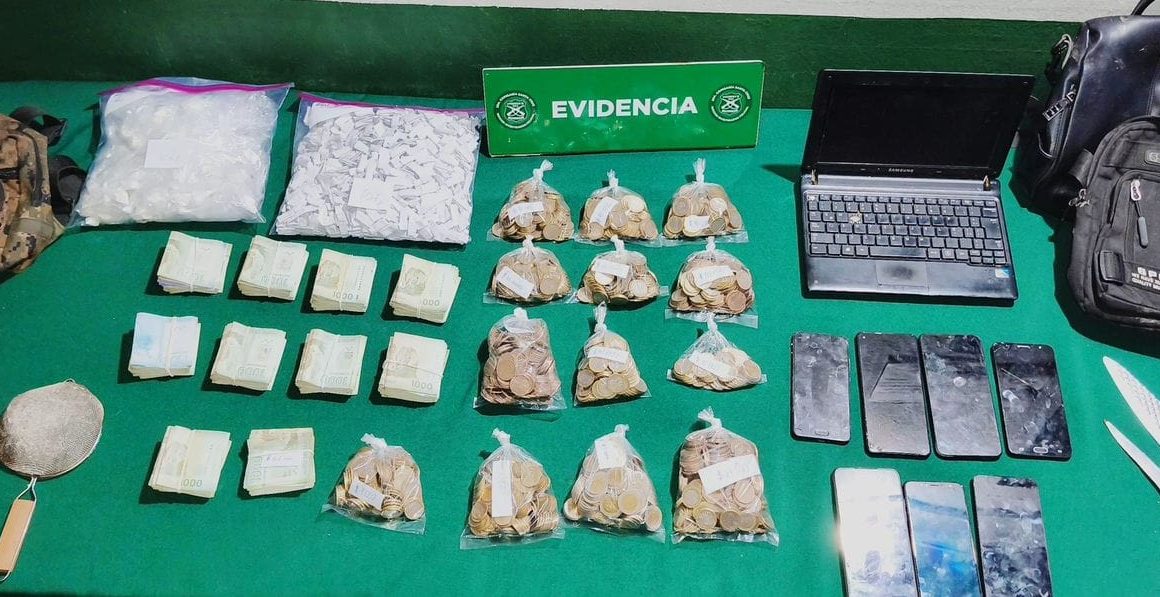 Durante el procedimiento se logró la incautación de 116 gramos 300 miligramos de cocaína base, en 62 bolsas de nylon transparente; y 185 gramos 800 miligramos de cocaína base, en 707 envoltorios de papel cuadriculado. Además, de un millón 164 mil 820 pesos en efectivo, 7 teléfonos celulares, 1 notebook y 2 armas blancas. Fiscalía dispuso el control de detención de los sujetos.