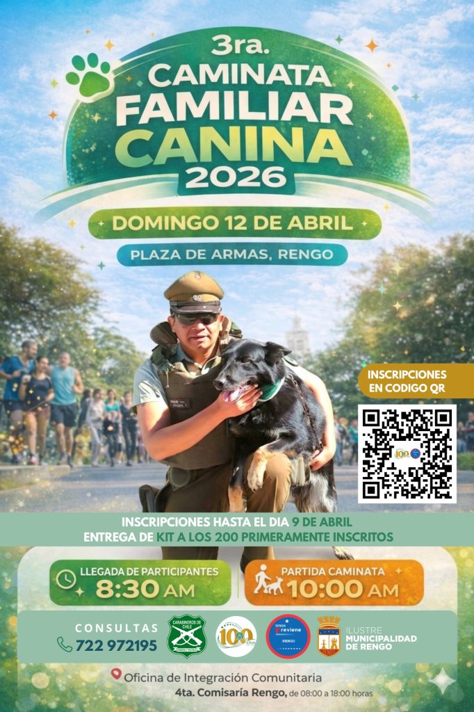 La comunidad de Rengo vivirá una jornada llena de buena convivencia y compromiso ciudadano con la realización de la “Caminata Familiar Canina: Carabineros de Todos”, una actividad recreativa organizada por Carabineros de Chile a través de la 4ª Comisaría de Rengo, en conjunto con Senda Previene.