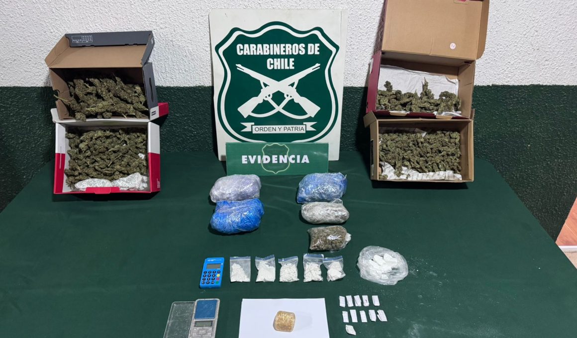 El procedimiento culminó cerca de las 23:30 horas con la detención de un tercer sujeto por el delito de receptación. En el inmueble se recuperaron especies vinculadas al robo y se incautaron además 1,5 kilos de Cannabis Sativa, 231 gramos de clorhidrato de cocaína, pesas digitales, teléfonos celulares y un dispositivo de pago electrónico (POS).