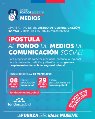 Portada ¡Atención medios de comunicación regionales! Postula al Fondo de Medios adminabril 8, 2025268 Vistas Quiénes pueden postular? Radios, diarios, revistas, TV y medios digitales regionales, provinciales y comunales con al menos 2… 0 Compartido 0 0